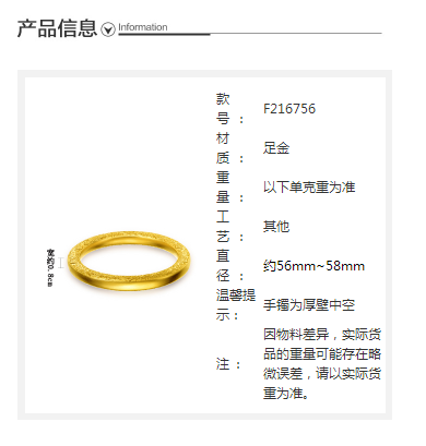 规格: 足金 工费5580元 56mm 足金 工费5580元 58mm 货号: F216756
